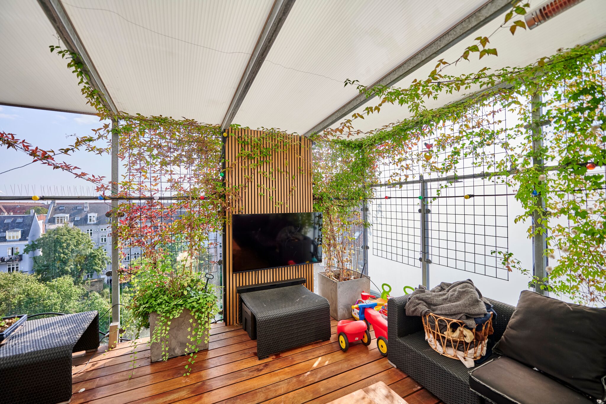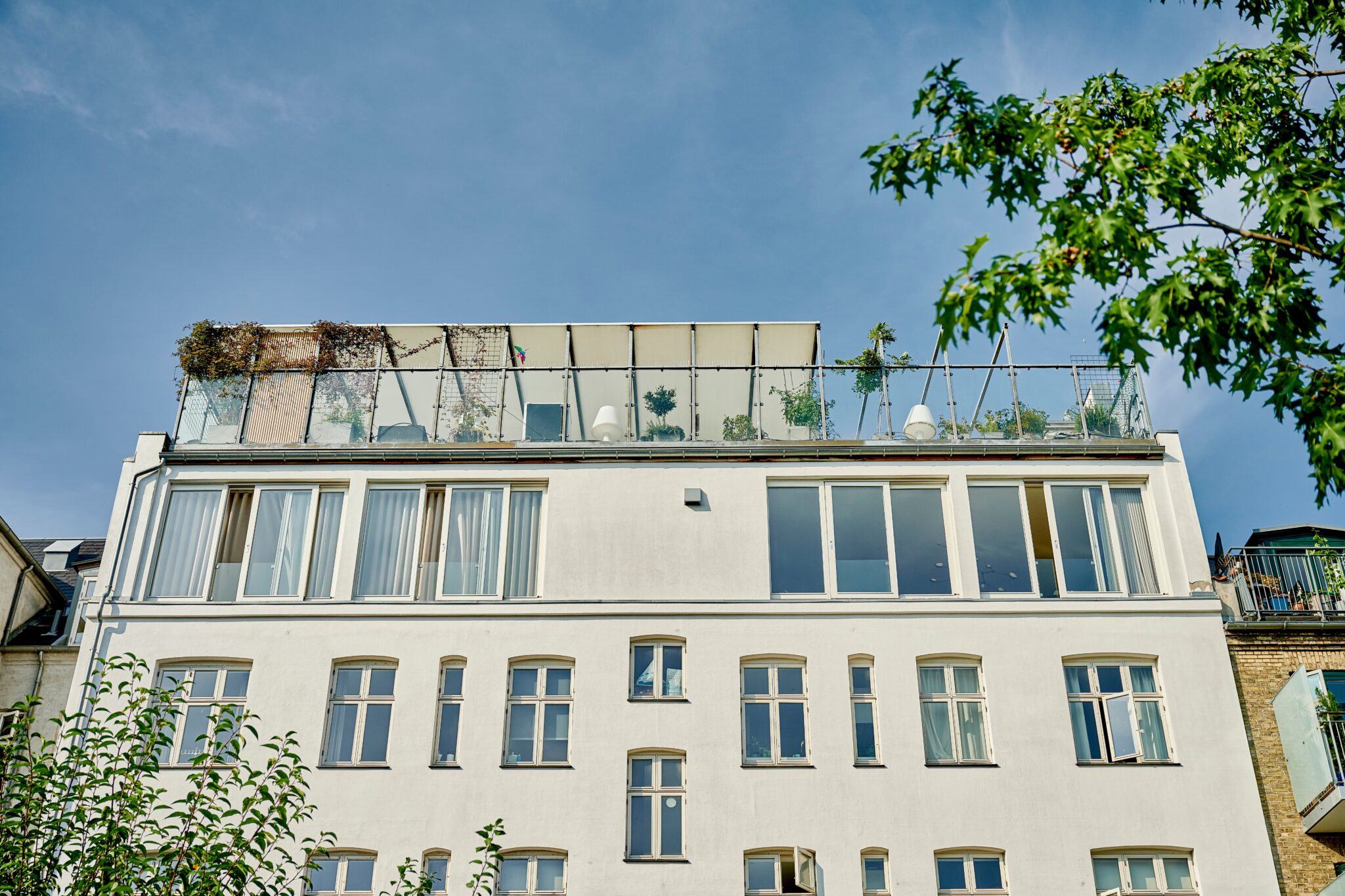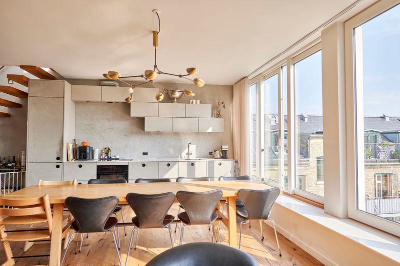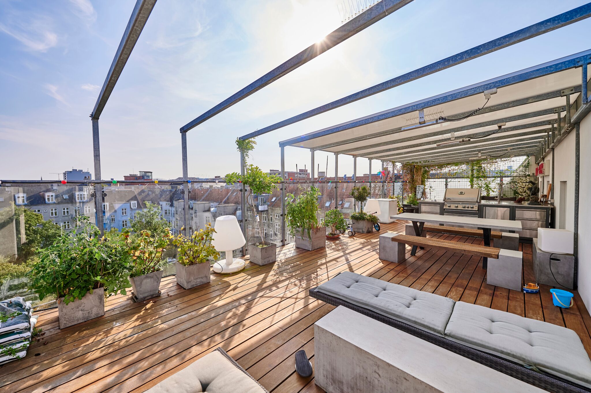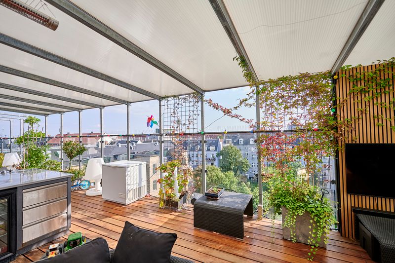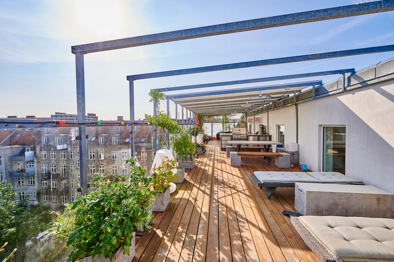 De høje lofter og de store vinduespartier skaber en fantastisk rumfornemmelse og giver boligen et eksklusivt, luftigt udtryk. Som kronen på værket får du adgang til en privat tagterrasse, hvor du kan nyde solen, udsigten og roen – helt uforstyrret. Perfekt til afslapning, hyggelige sommeraftener og eksklusive sammenkomster under åben himmel.