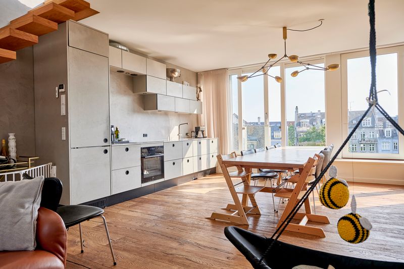 Lejligheden byder på tre indbydende soveværelser med god skabsplads og masser af naturligt lys. Det imponerende køkken-alrum er boligens naturlige samlingspunkt – et kæmpe, åbent rum med højt til loftet, hvor æstetik og funktionalitet går hånd i hånd. Her er der plads til både hverdagsliv og store middage med familie og gæster.