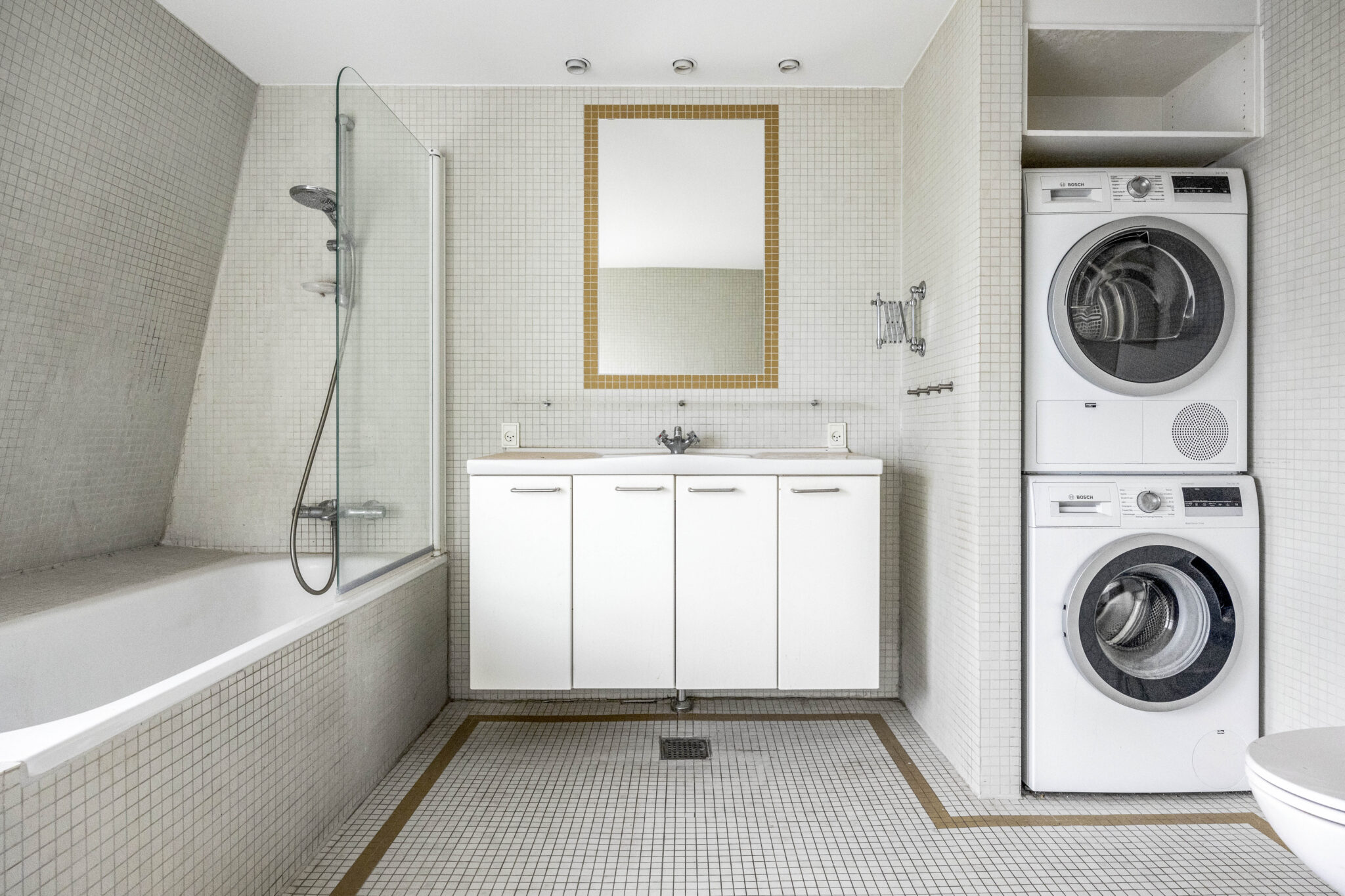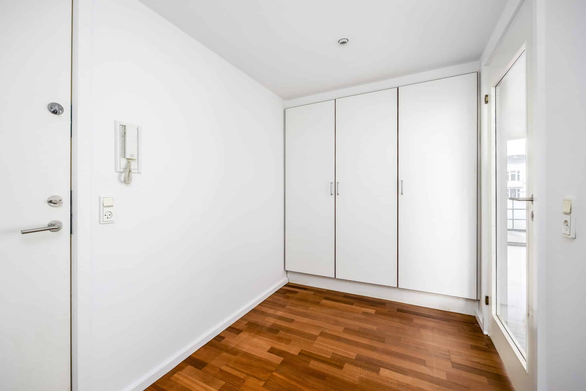 Elevator i opgangen og adgang indenfor i denne lejlighed som byder på en stor entre med skab og adgang til et godt gæste badeværelse med brus og toilet.