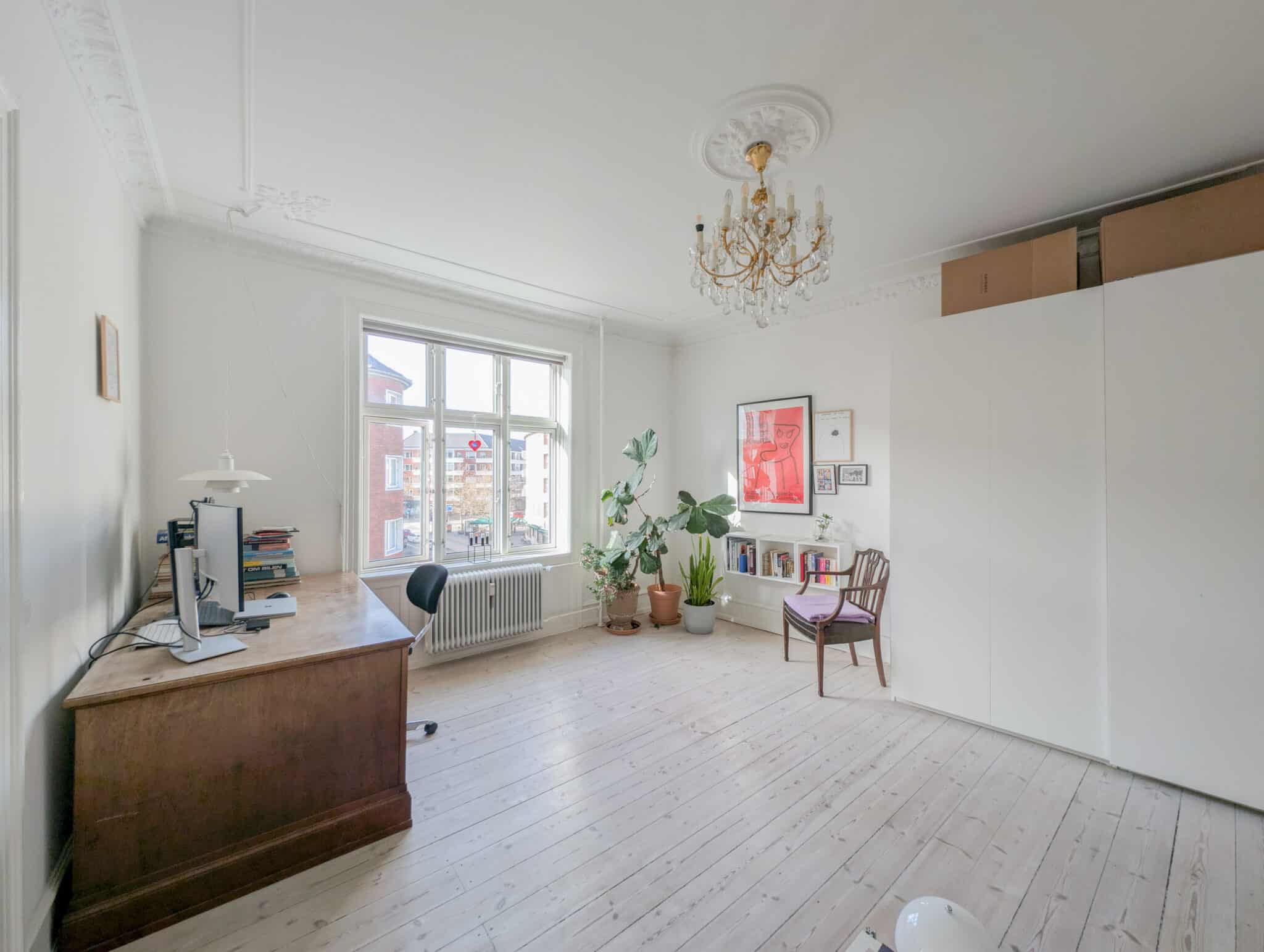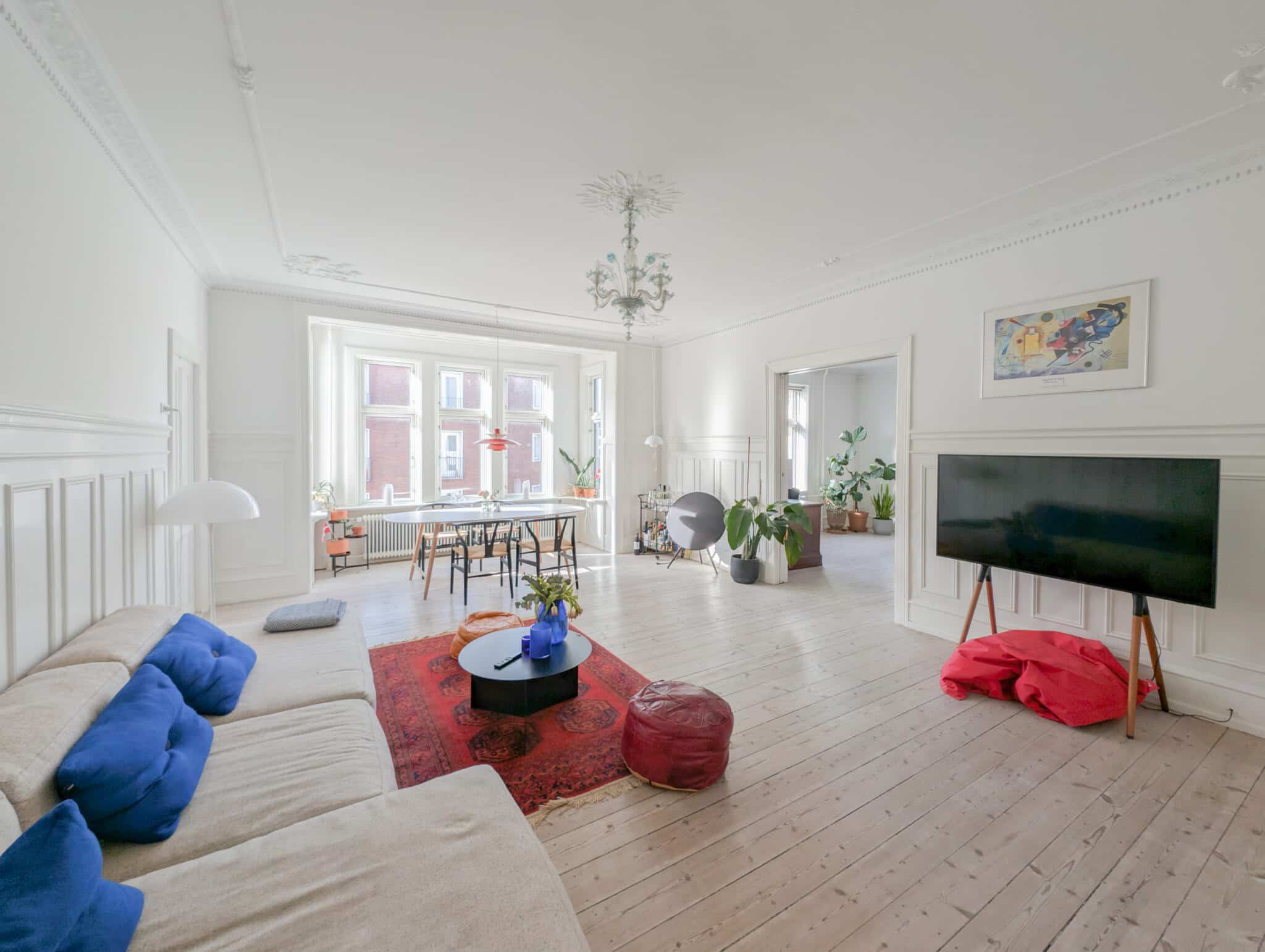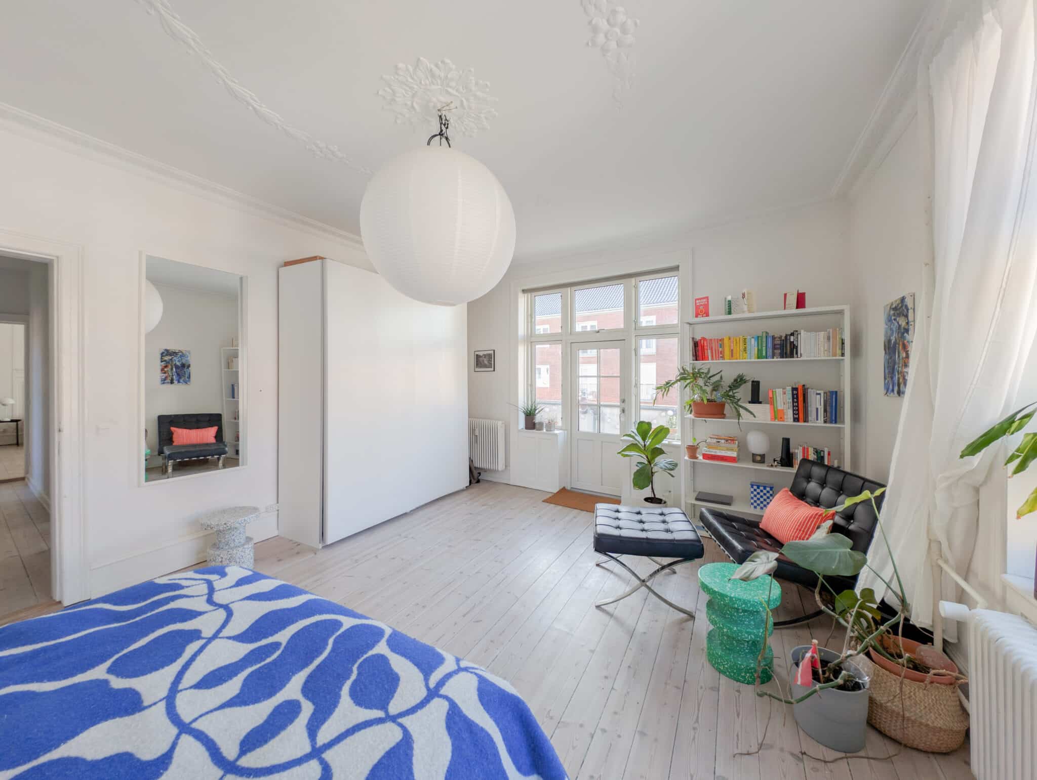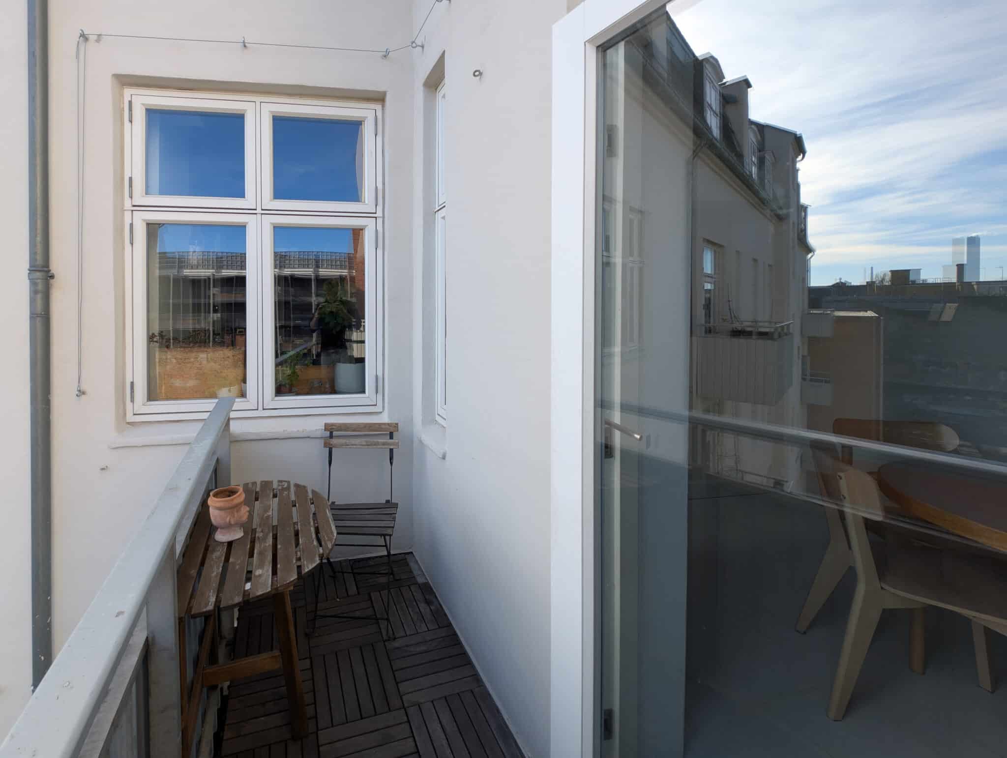 Denne utroligt flotte møblerede og herskabelige lejlighed byder på en rummelig entré, to stuer en suite hvor den ene er indrettet som kontor med gæsteseng og den anden som opholdsstue. Det ene soveværelse er yderst rummeligt og har adgang til en skøn altan og det andet soveværelse har også en god størrelse og er placeret i den modsatte ende af lejligheden. Badeværelset har seperat bruseniche og vaskesøjle og det flotte snedkerkøkken har både vinkøleskab, spiseplads samt udgang til en solrig altan.