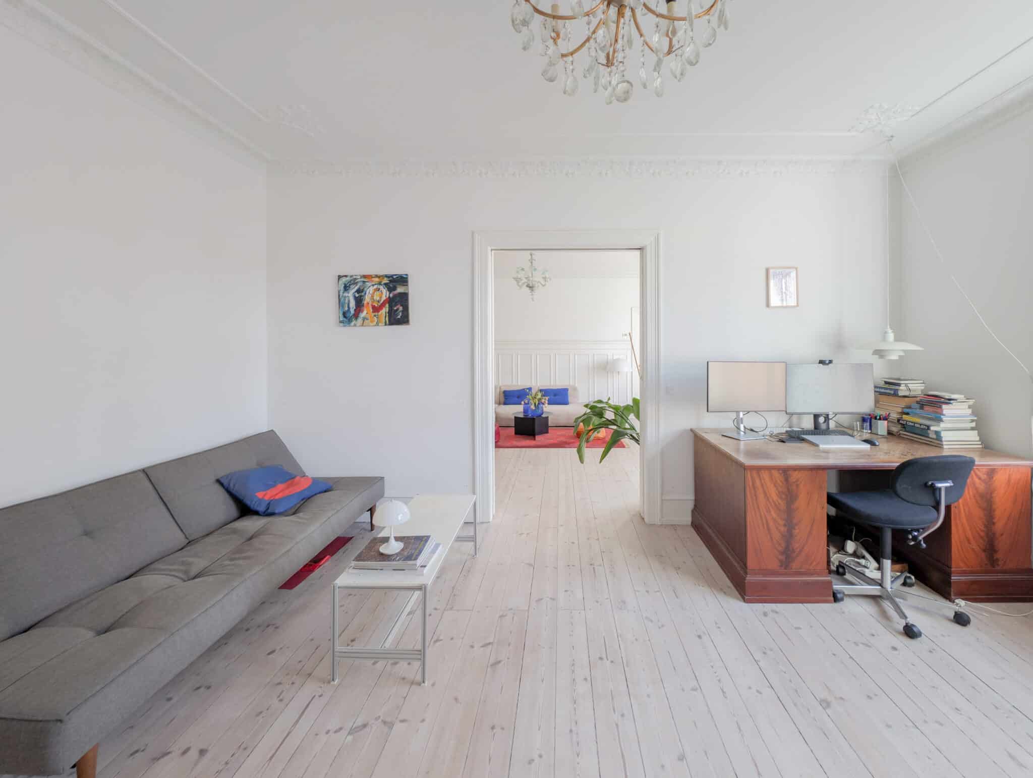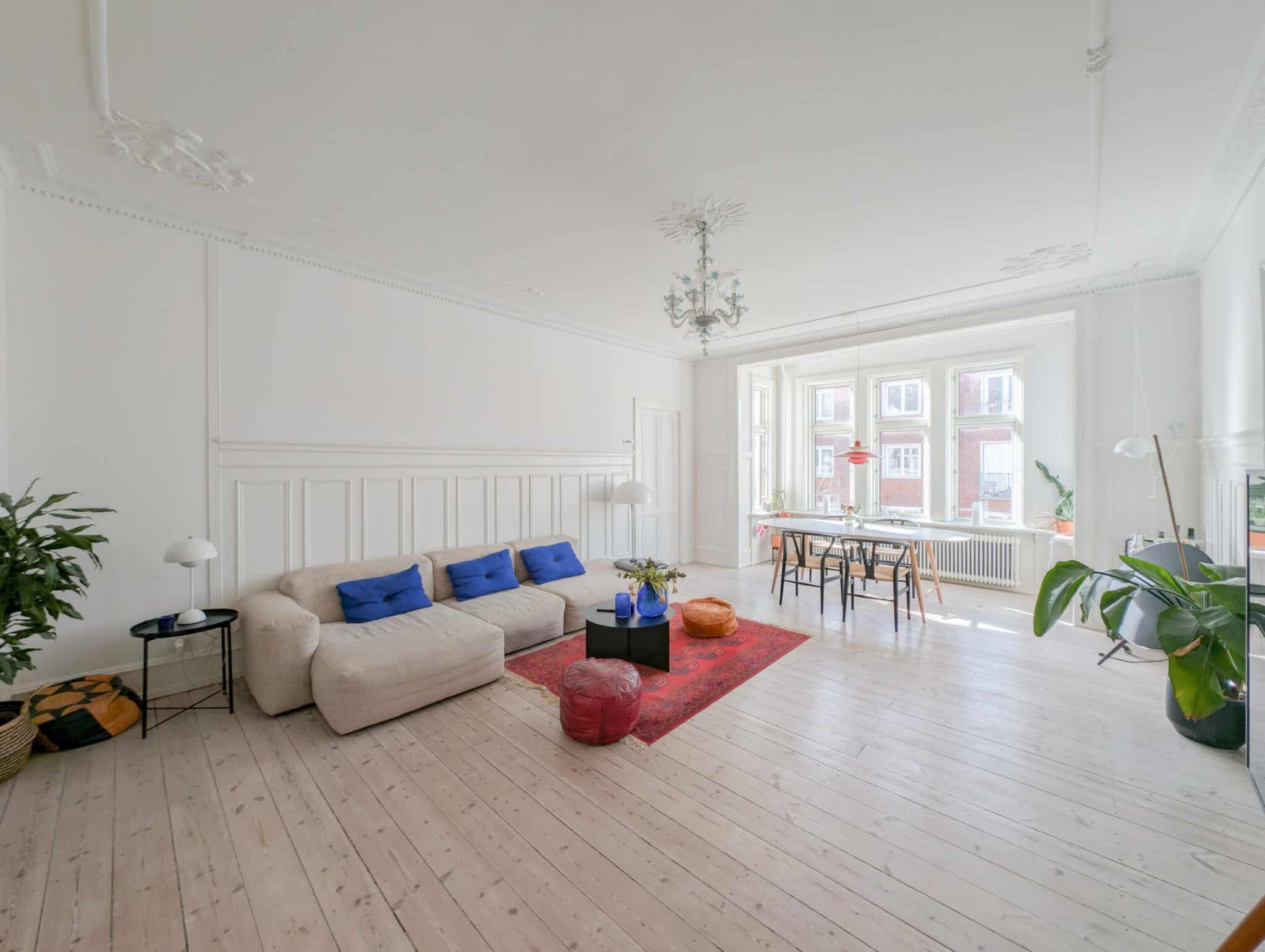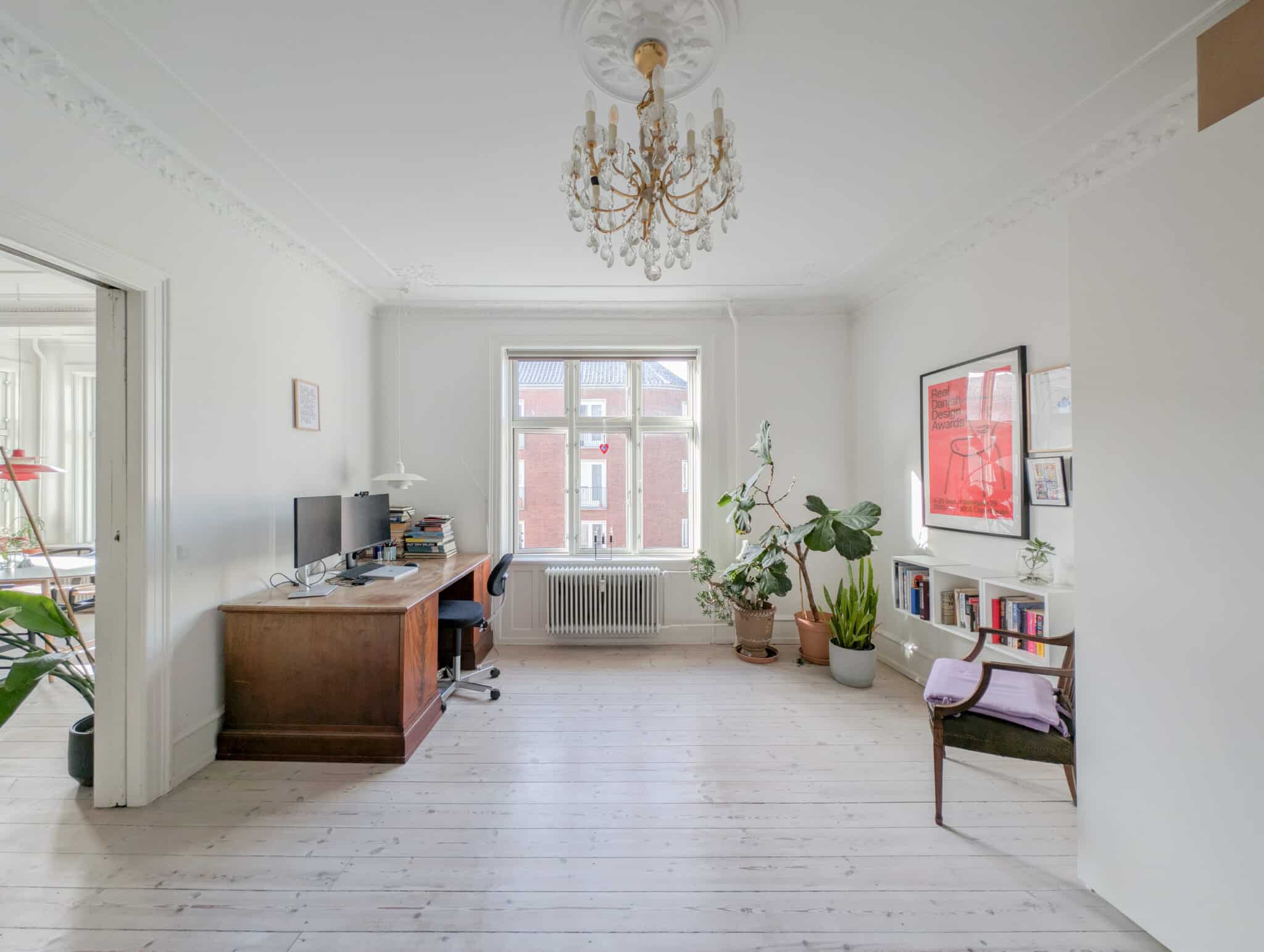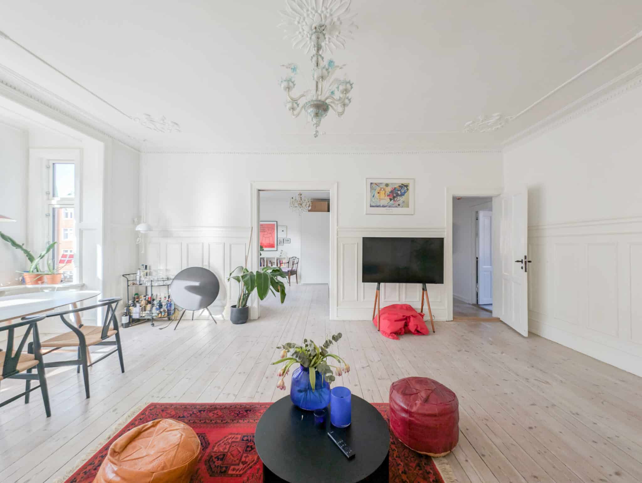 Denne utroligt flotte møblerede og herskabelige lejlighed byder på en rummelig entré, to stuer en suite hvor den ene er indrettet som kontor med gæsteseng og den anden som opholdsstue. Det ene soveværelse er yderst rummeligt og har adgang til en skøn altan og det andet soveværelse har også en god størrelse og er placeret i den modsatte ende af lejligheden. Badeværelset har seperat bruseniche og vaskesøjle og det flotte snedkerkøkken har både vinkøleskab, spiseplads samt udgang til en solrig altan.