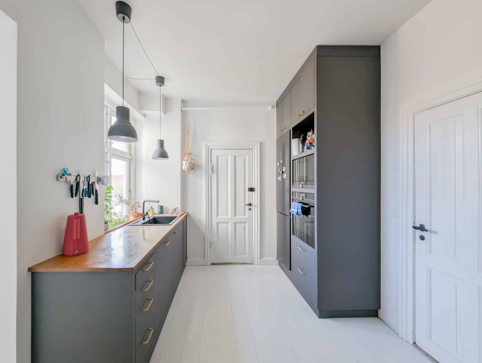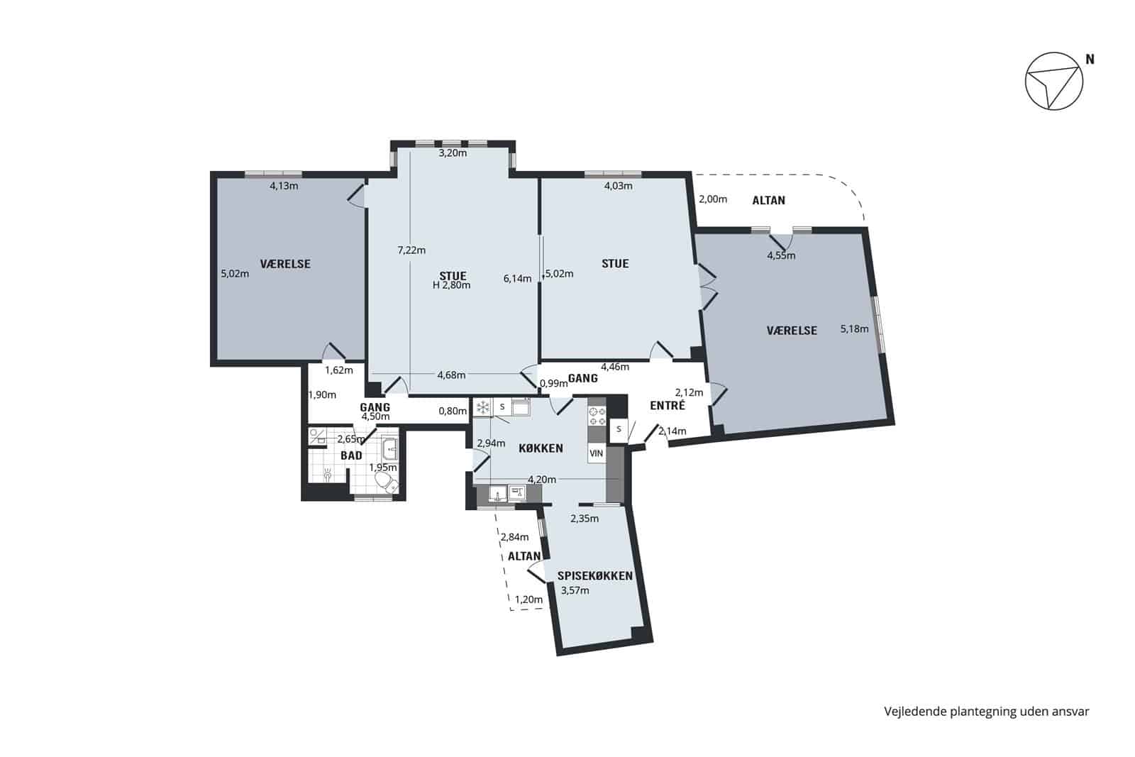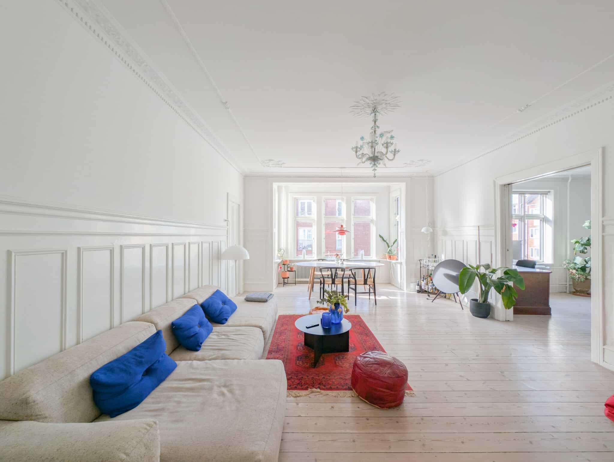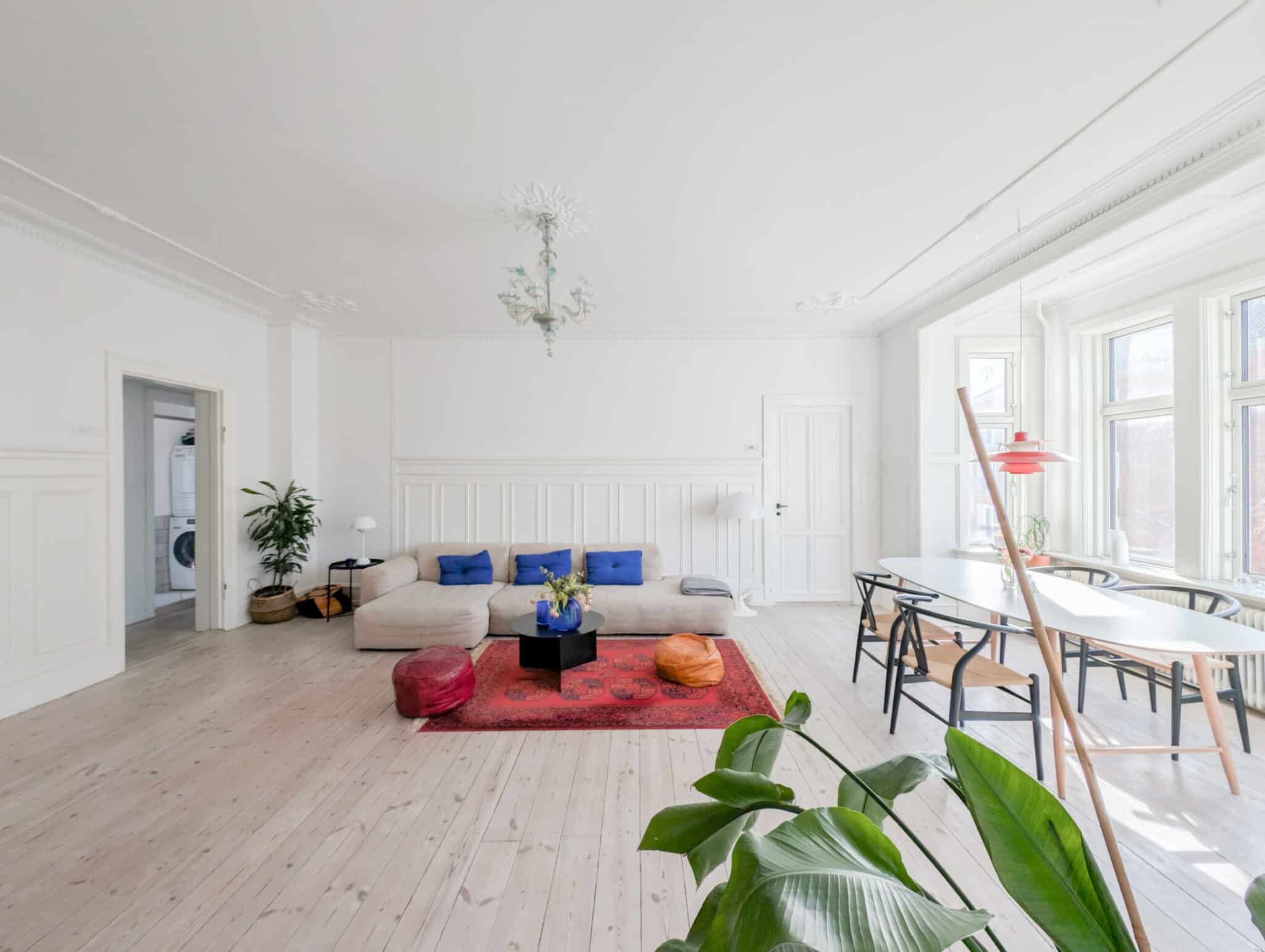 Denne utroligt flotte møblerede og herskabelige lejlighed byder på en rummelig entré, to stuer en suite hvor den ene er indrettet som kontor med gæsteseng og den anden som opholdsstue. Det ene soveværelse er yderst rummeligt og har adgang til en skøn altan og det andet soveværelse har også en god størrelse og er placeret i den modsatte ende af lejligheden. Badeværelset har seperat bruseniche og vaskesøjle og det flotte snedkerkøkken har både vinkøleskab, spiseplads samt udgang til en solrig altan.