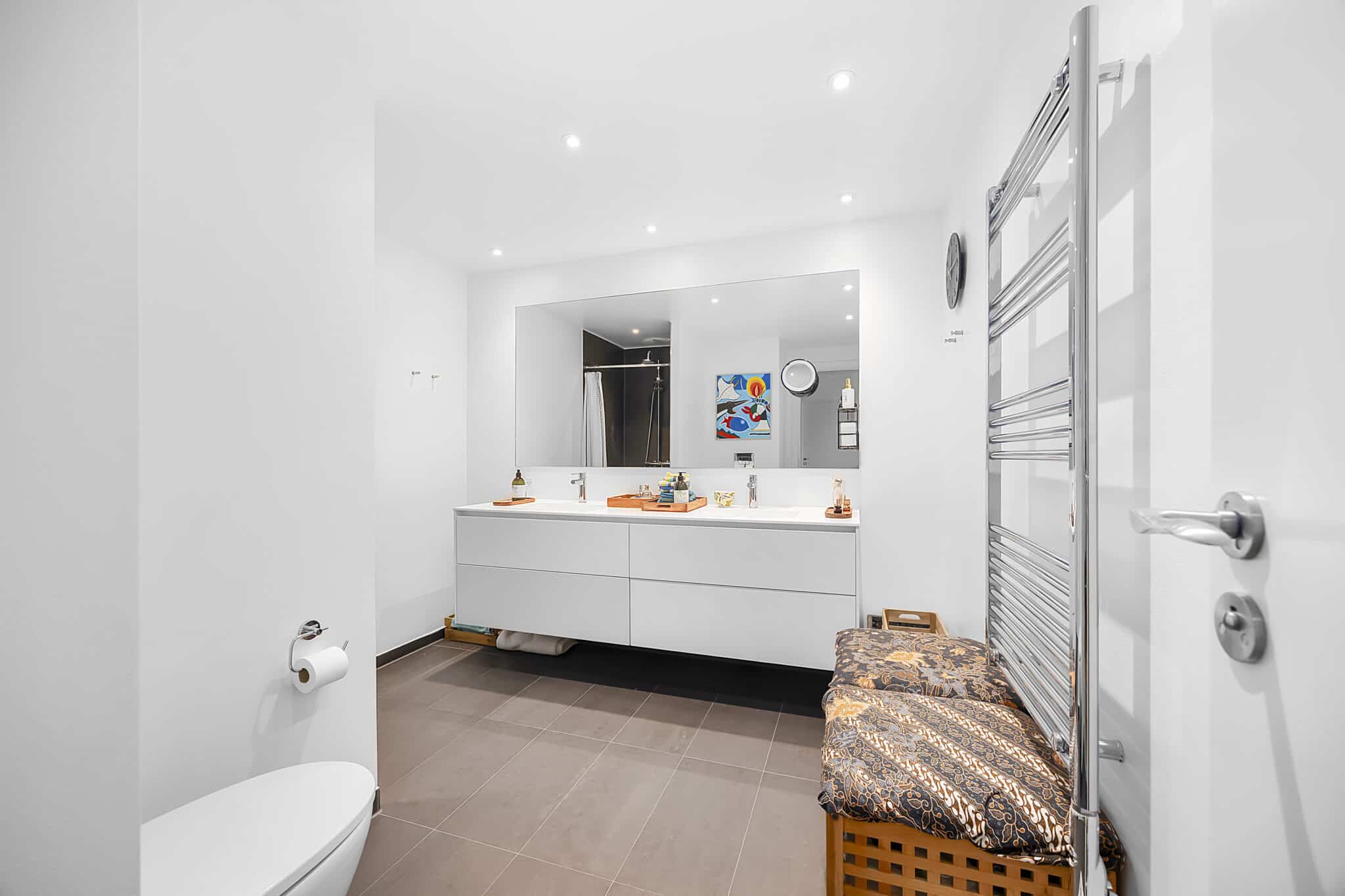 Lejligheden har et stort og moderne badeværelse med god opbevaringsplads og komfortable løsninger. Planløsningen er optimal for både familier og par, der ønsker god plads og høj boligkomfort.