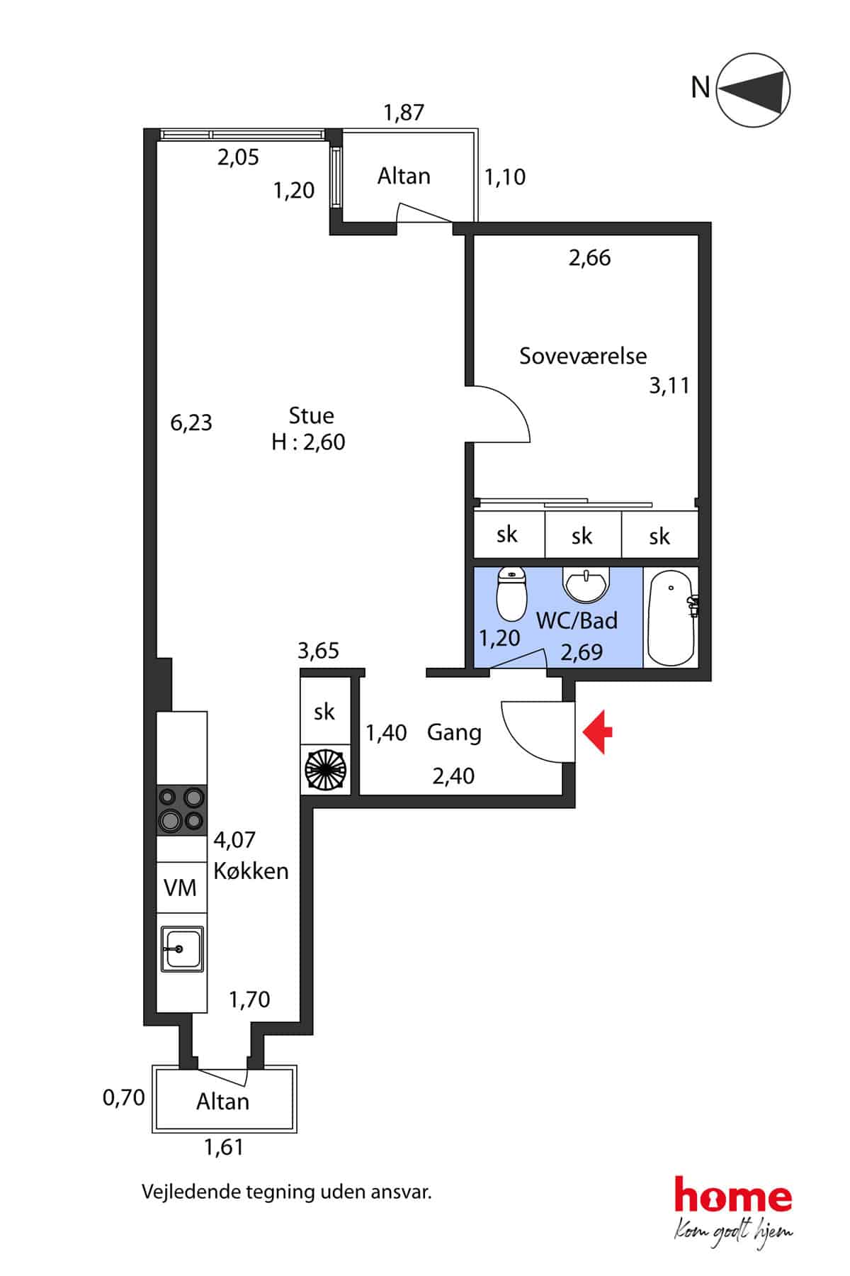 Lejligheden byder på en velindrettet planløsning med rummelig entré, et dejligt soveværelse samt en hyggelig og lys stue med direkte udgang til sydvendt altan. Her kan du nyde solen og følge med i byens liv. Pænt køkken med masser af god skabs- og bordplads og med udgang til endnu en altan mod gården – perfekt til morgenkaffen i rolige omgivelser. Badeværelset fremstår pænt og funktionelt.