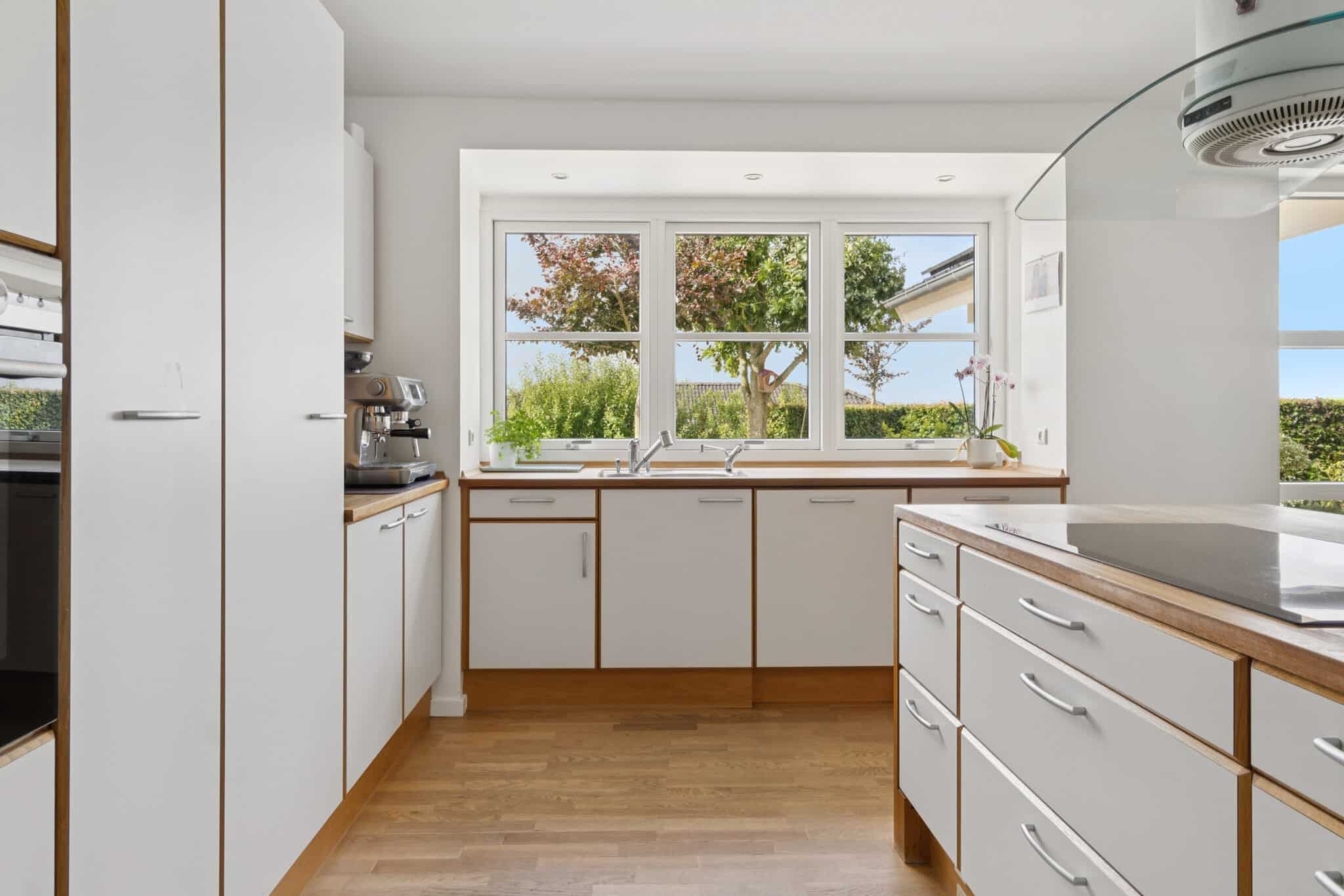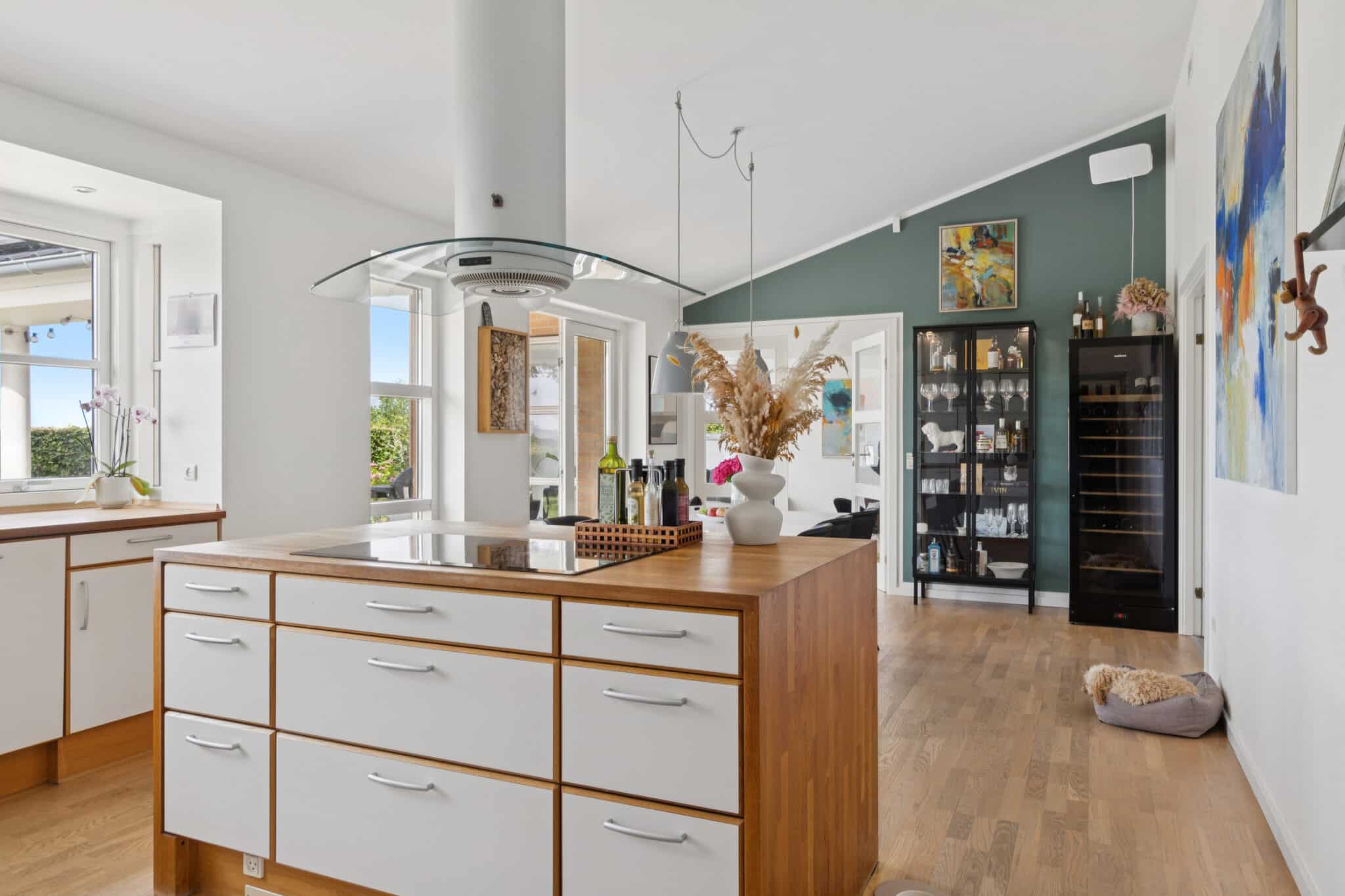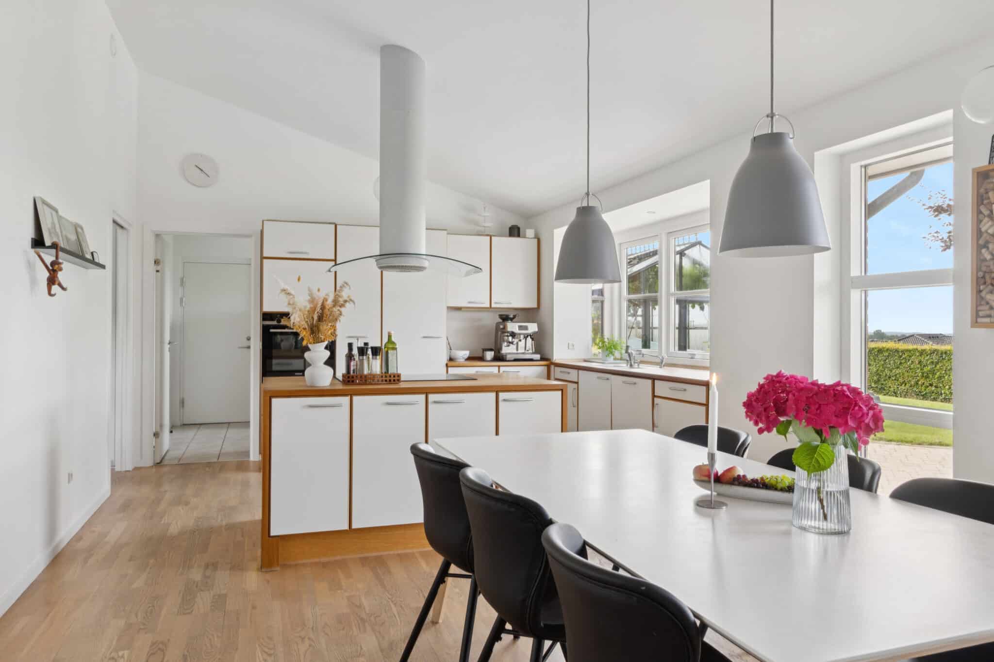 Et stort lækkert køkken alrum med adgang til terrassen samt haven og med adgang til den store og lyse samt rummelige stue.