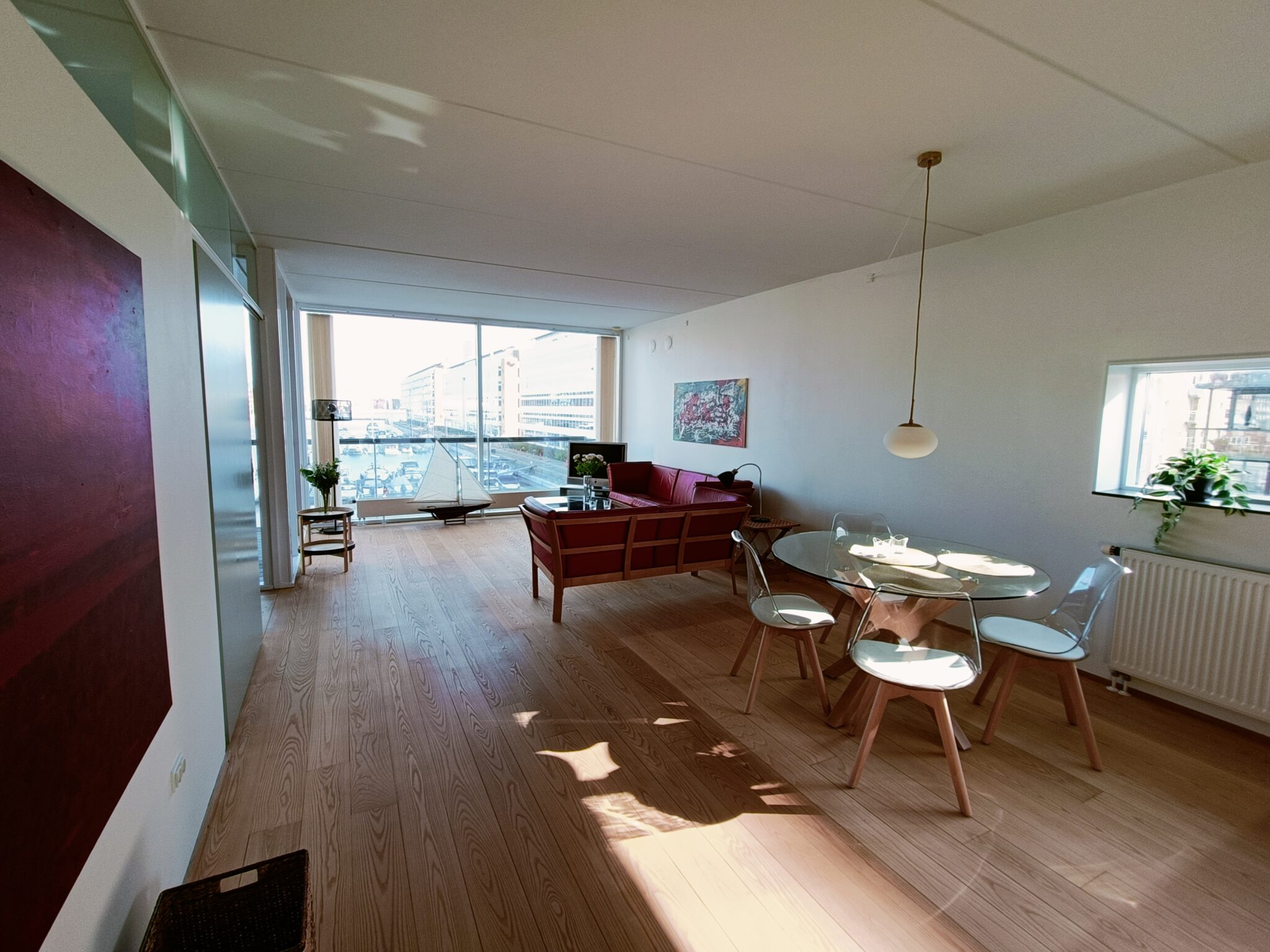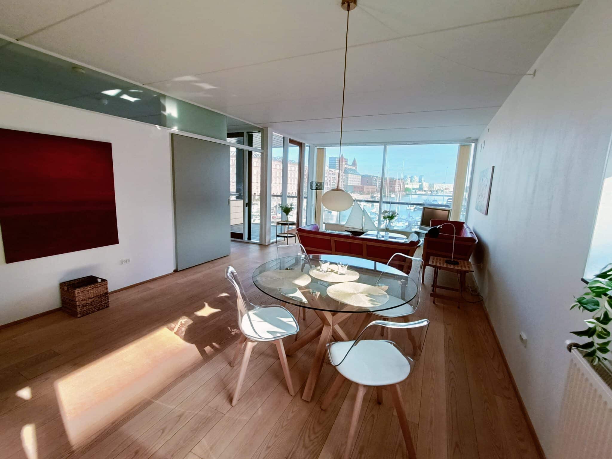 Hjertet i lejligheden er det skønne og lyse køkken alrum i åben forbindelse med spisestuen og dagligstuen samlet i ét, hvor den fantastiske udsigt til vandet kan nydes.
